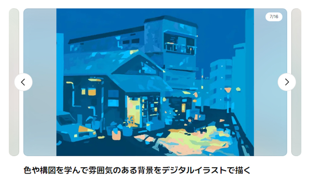 デジタルイラストカテだけでも、人物・マンガ・コンセプトアートなど複数の小カテゴリがあるので、色々な講座を幅広く学んだり、スキルアップしたい講座のみに絞って集中的に学ぶなど、ご自身のゴールに合った受講スタイルで進めて行くことができます。